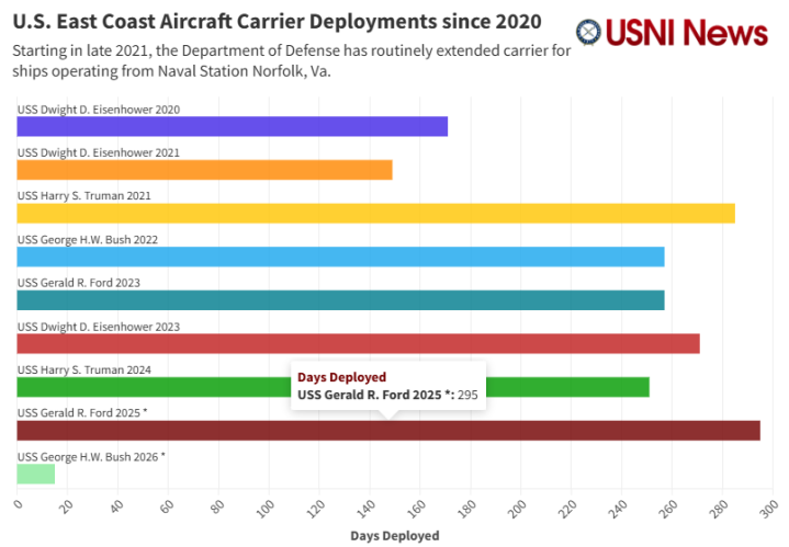 图表显示,自2021年的“哈里·杜鲁门”号部署以来,美国东海岸航母部署时长猛增USNI新闻网