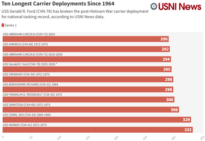 USNI新闻网在报道中表示,这不仅打破了冷战后航母部署的时长记录,这一延长部署计划也将使得“福特”号打破自越南战争以来在国家任务中的航母部署纪录(国家任务即不包含训练或特殊情况下的疫情隔离,因此“尼米兹”号在2020年至2021年因在关岛隔离造成的离开母港341天不计入在内)。根据历史数据显示,越南战争期间在北部湾支援空中行动的CVA-41“中途岛”号,于1972至1973年间创造了长达322天(不到11个月)的部署记录。